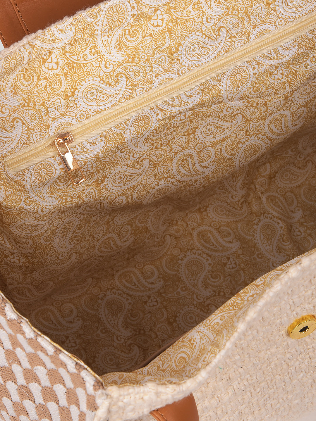 Elevate your everyday with Soléa, a modern classic that marries artisan texture with structured elegance. Crafted from a rich woven fabric and detailed with smooth tan faux leather, this tote stands out with its softly geometric silhouette and contrast checkerboard side panels.